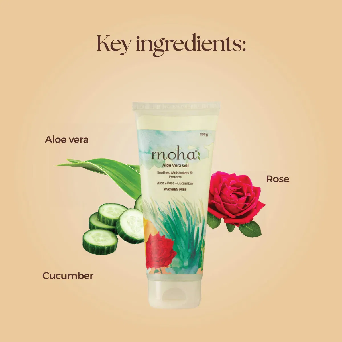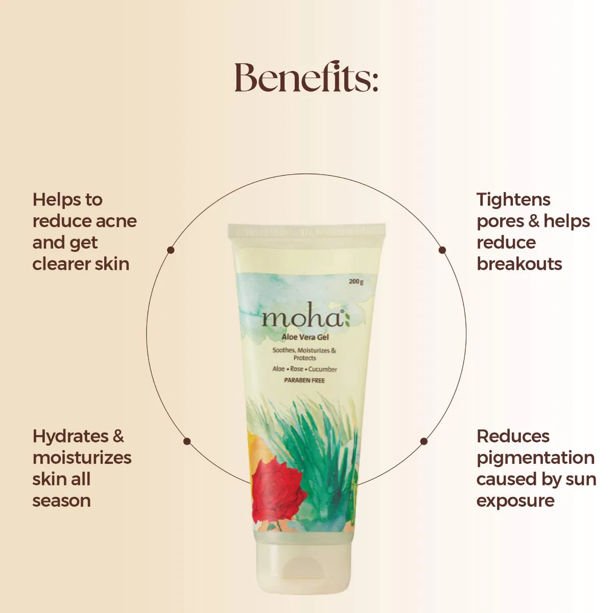 Увлажняет и успокаивает: moha: Гель алоэ вера глубоко увлажняет кожу, делая её мягкой, эластичной и даря ощущение комфорта. Кроме того, его успокаивающие свойства снимают раздражение, вызванное воздействием солнца, сухостью или бритьём. Способствует уменьшению пигментации и прыщей: попрощайтесь с неровным тоном кожи и пятнами! moha: Рекомендуемый гель алоэ вера помогает уменьшить пигментацию, вызванную воздействием солнца, и способствует очищению кожи, минимизируя появление прыщей.