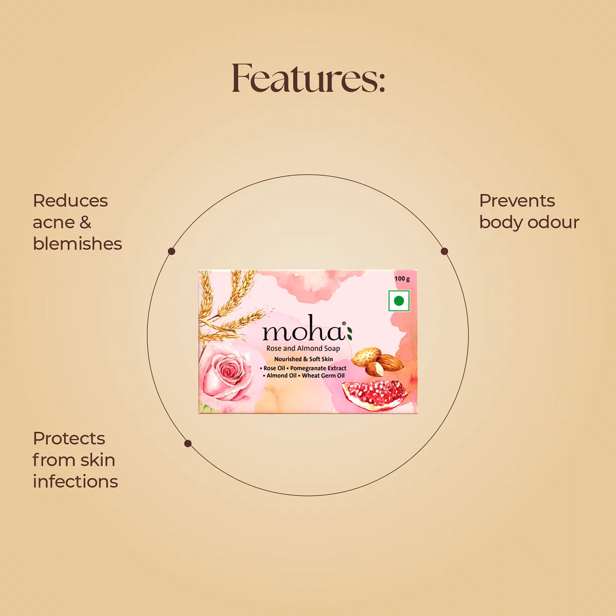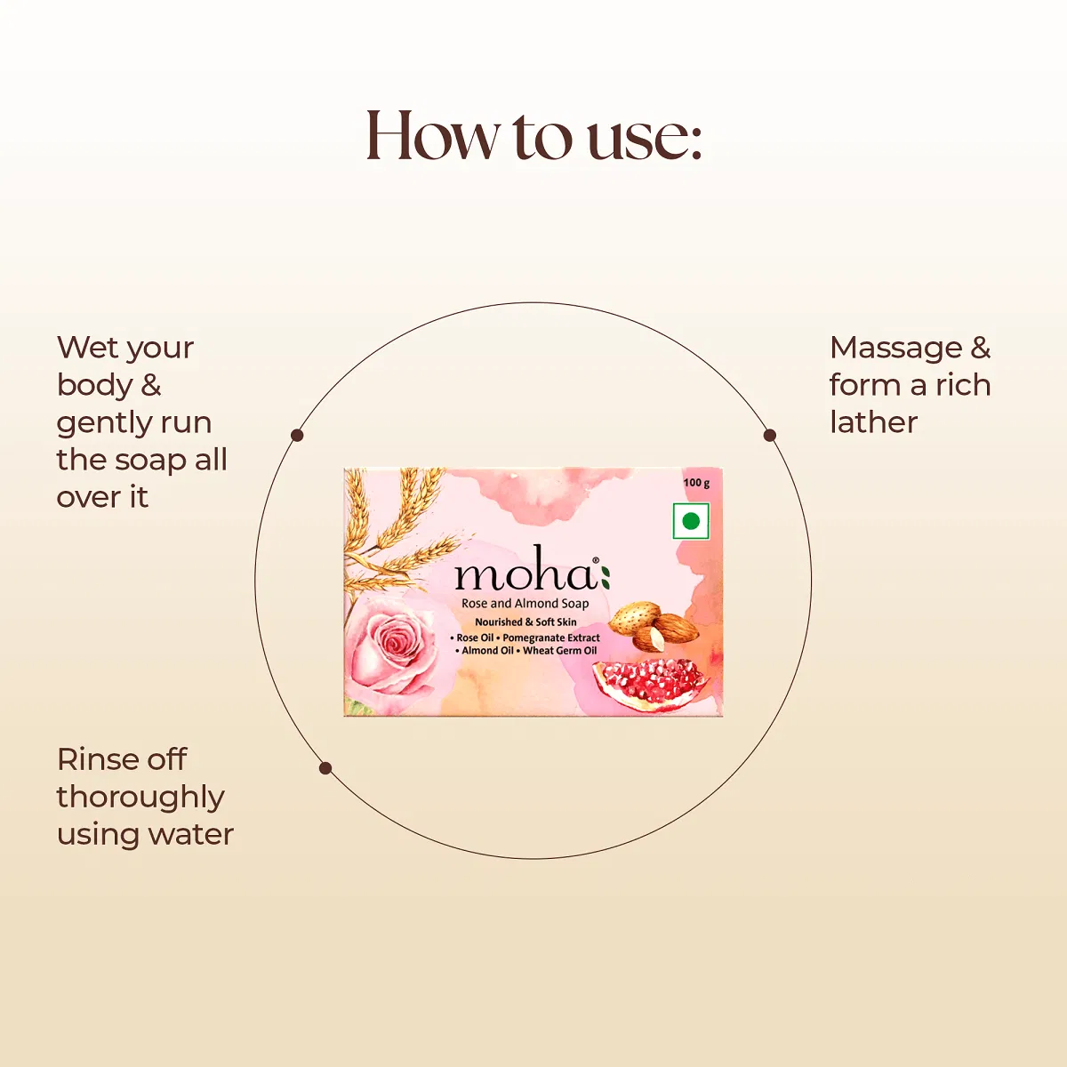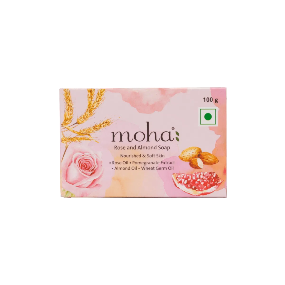 Побалуйте свои чувства и омолаживайте кожу с роскошным мылом Moha: Rose and Almond Soap для мягкой, напитанной и молодой кожи. Обогащенное экзотическим маслом розы и питательным маслом миндаля, оно сохраняет влагу в коже, открывая напитанную, мягкую и сияющую кожу. Богатый антиоксидантами гранат способствует обновлению клеток и сохраняет кожу молодой и упругой, а обогащенное витамином Е масло зародышей пшеницы защищает от вредного воздействия окружающей среды и уменьшает сухость кожи, воспаления, темные пятна и шрамы. Мыло Moha: Rose and Almond Soap - это мыло класса -1 с TFM 76%, что делает его увлажняющим куском для ванны для всей семьи и заботится о старении кожи, тусклости и сухости. Обычное мыло удаляет естественную влагу из кожи, но мыло Moha: Rose and Almond Soap сохраняет целостность кожи и делает ее удивительно мягкой, напитанной и молодой.